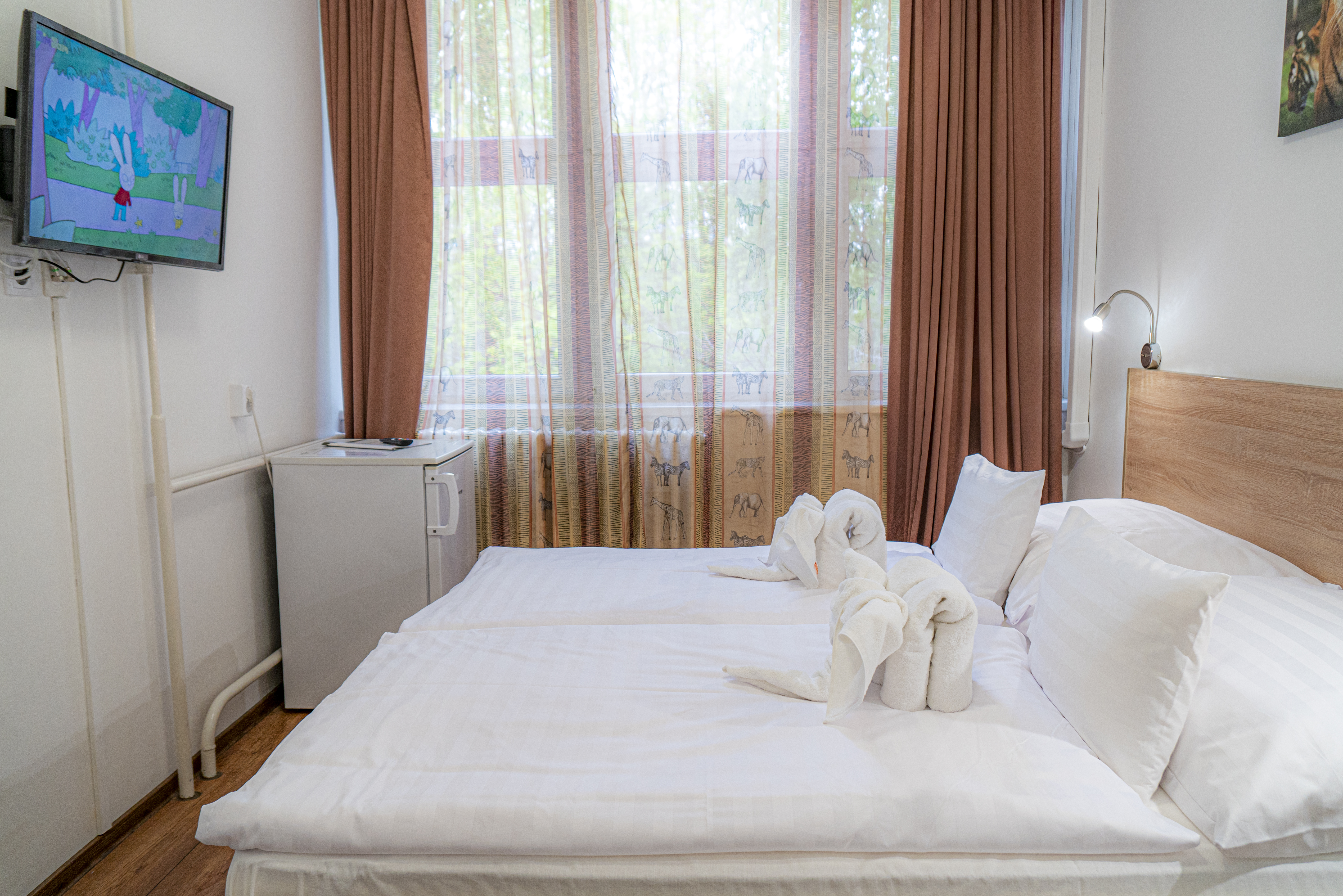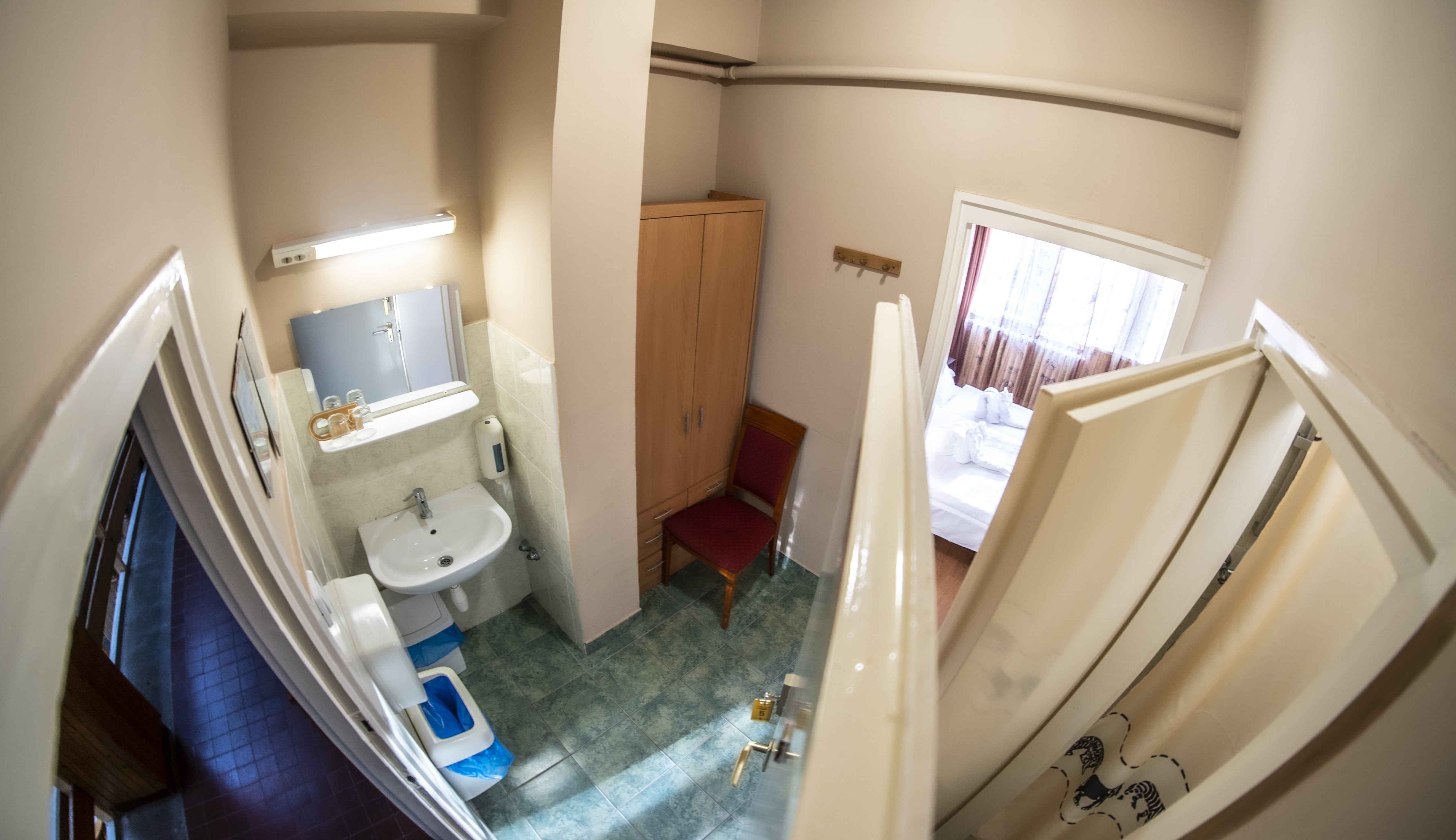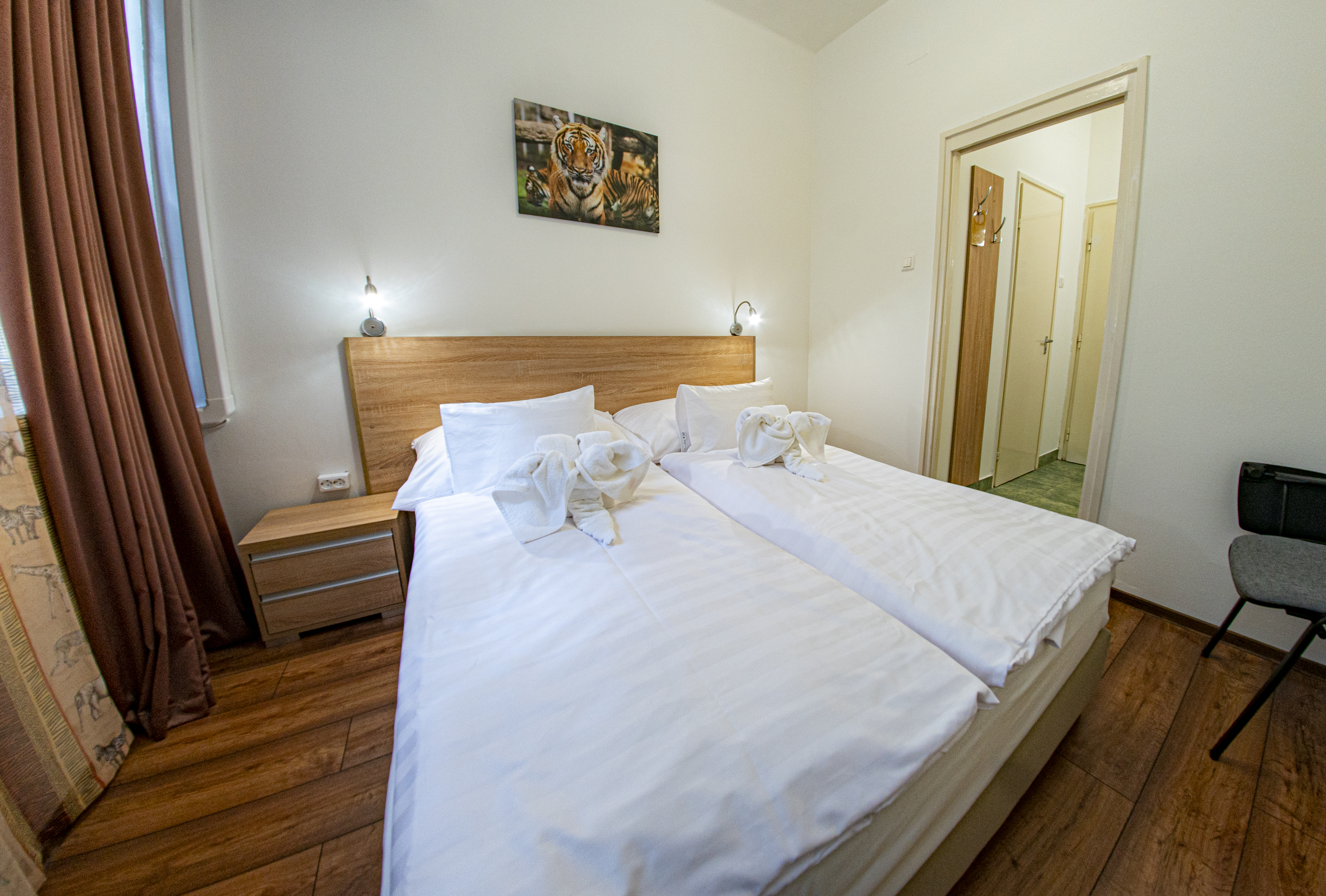 The room is suitable for 2 people, an excellent choice for couples in transit! Our rooms have two separate 90 x 200 cm-sized beds or a 160 x 200 cm-sized double bed. Floor area: 15 m2. Baby cots or extra beds cannot be placed here due to the small floor area of the room.