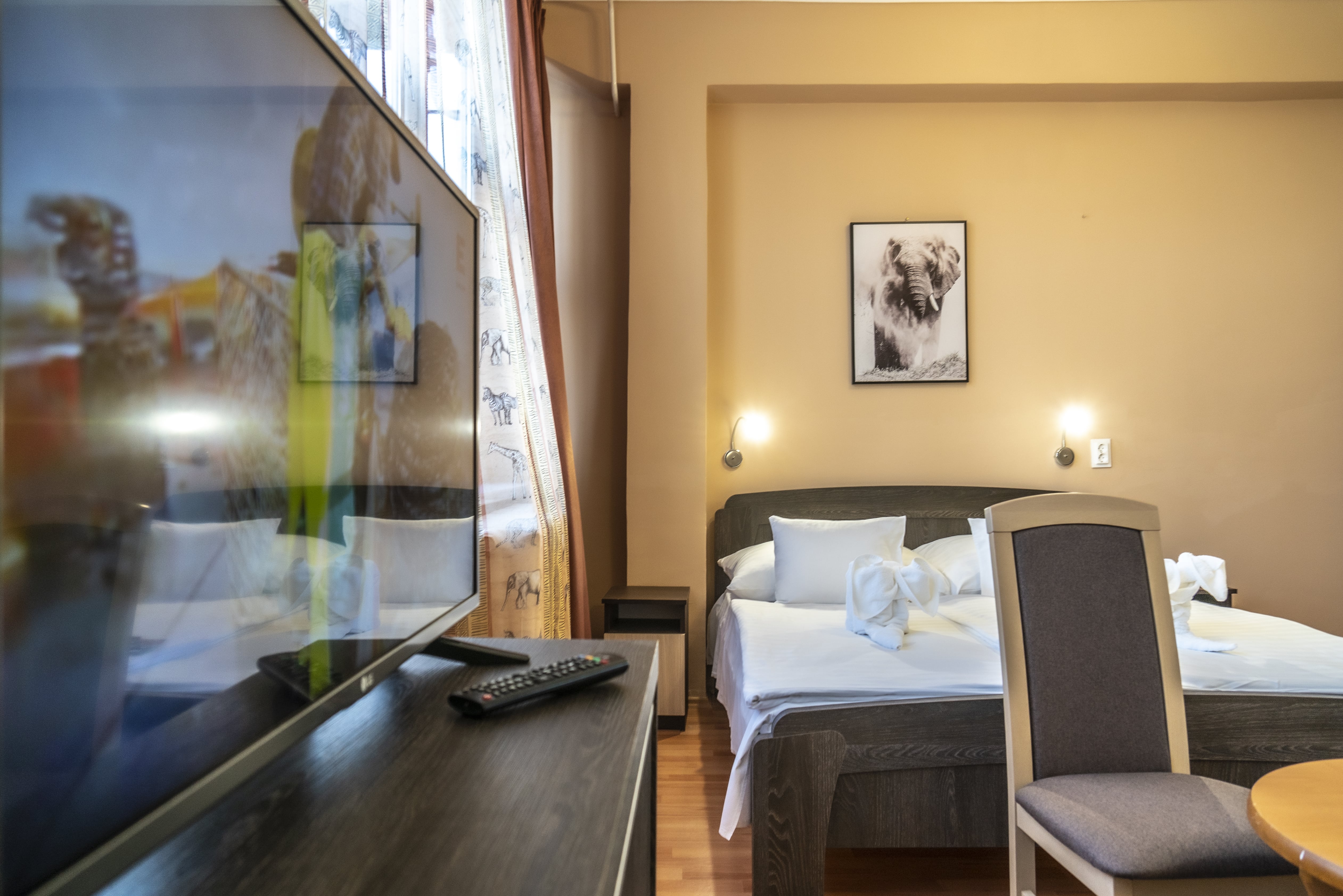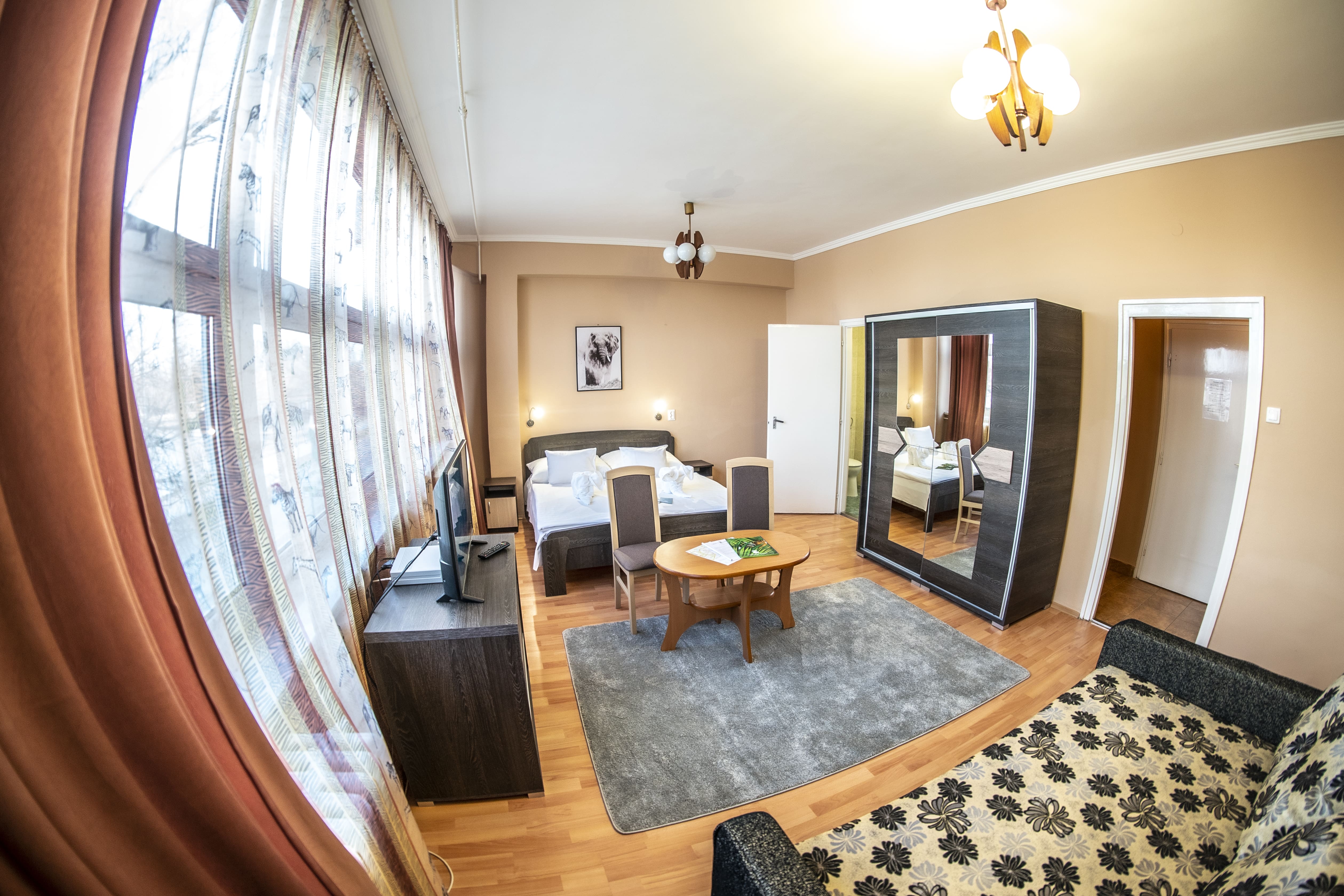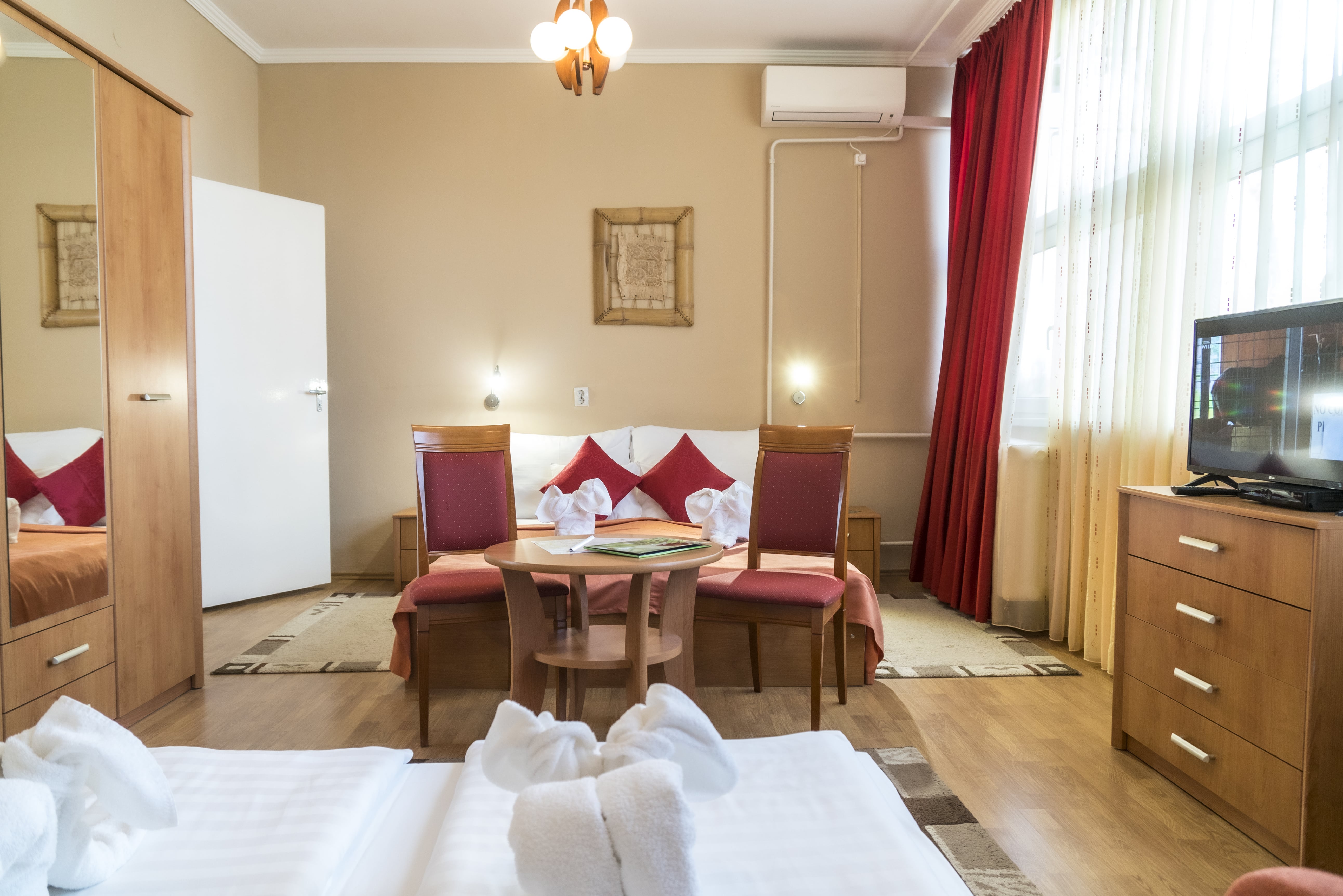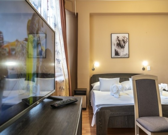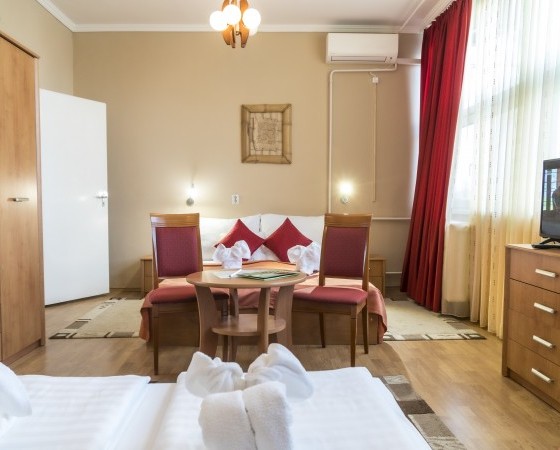 A festői szépségű Sóstói tóra néző klimatizált egylégterű szobáink 3-4 tagú család részére kényelmes pihenést nyújtanak. Az éjszakai pihenést 160 x 200 cm franciaágy, valamint egy darab 2 személyes kihúzható 160 x 200 cm kanapé szolgálja. Alapterület: 24 m2.